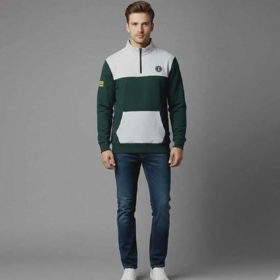 Men's Color Block Quarter-Zip Sweatshirt with Pouch Pocket | Casual Anchor Logo Pullover | Dark Green & Grey Funnel Neck Jumper