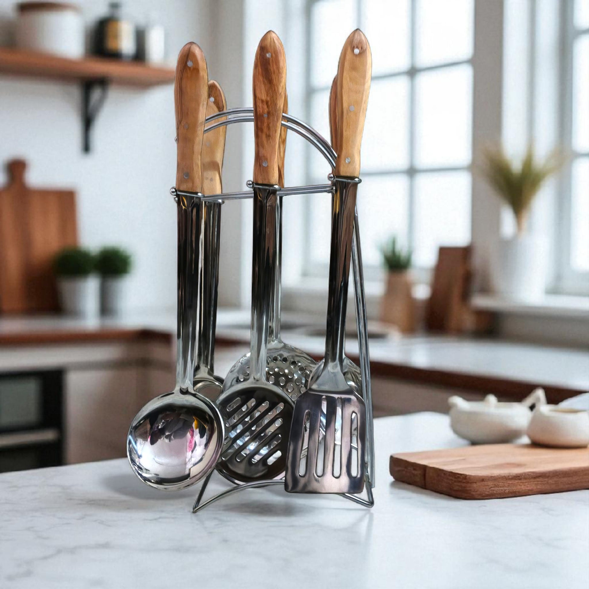 Premium Stainless Steel Kitchen Utensil Set with Wooden Handles | 6-Piece Cooking Spoon & Spatula Tool Collection with Stand | Heavy Duty Kitchen Tools for Home & Professional Use